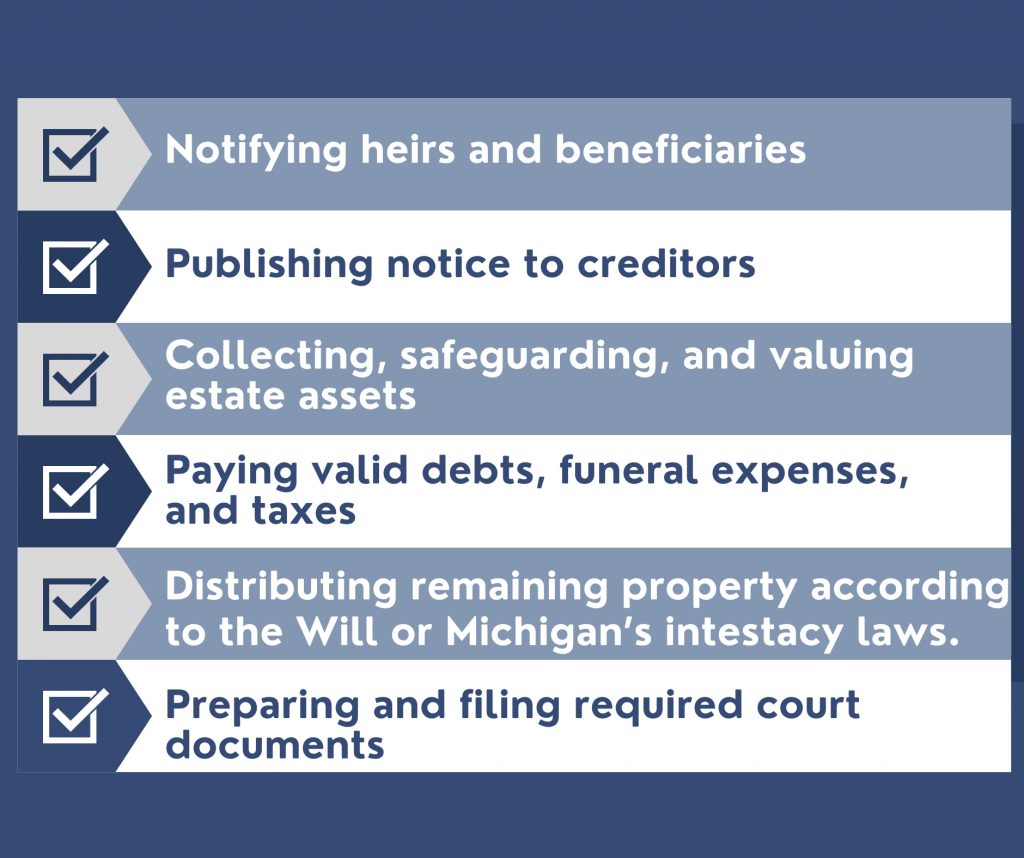 When someone dies intestate (without a Will), Michigan’s inheritance laws decide who receives the estate. The personal representative still manages the same duties, but instead of following written instructions, they follow the order of heirs set by statute.